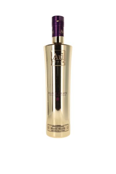 Au Vodka Black Grape attire immédiatement l'attention avec sa bouteille élégante avec une couleur dorée frappante et des détails violets.