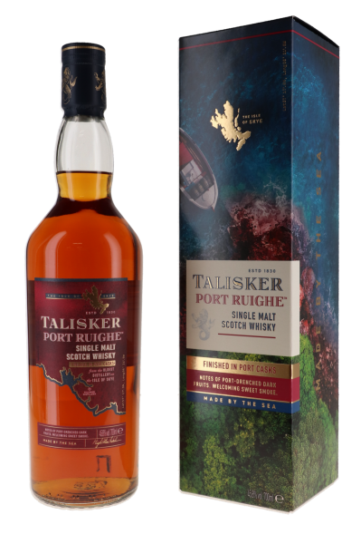 Peu de whiskys soutiennent aussi bien leur origine que le Talisker. Ce whisky de malt est doublement vieilli dans des fûts de port comme un hommage aux commerçants écossais qui affrontaient les mers inhospitalières et apportaient une contribution essentielle à la création du commerce portuaire. Port Ruighe, prononcé « Portree » est le nom gaélique pour la ville portuaire animée de Skye. La saveur portuaire en fin de bouche combine le caractère puissant et salé de Talisker avec des touches douces de fruit rouge. Chaque gorgée a le fumé doucereux du feu de bois et le fruité plein des prunes mûres. Ce single malt a un corps moyen et une saveur fumée et salée. Le poivre piquant passe vite et est remplacé par un arôme tourbeux, alors qu'un fumé crémeux se mélange aux épices et au fruit sombre. La fin de bouche est longue : mémorable et puissante. Saveur attirante sur la langue avec une sécheresse fumée et intensément cacaotée. Talisker Port Ruighe doit être bu pur.