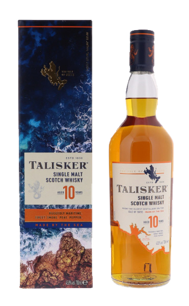 Doublement distillé pour un caractère riche et profond qui dévoile les propriétés salines d’un whisky de la côte. Le Talisker 10 Year Old est la valeur sûre de la gamme Talisker et l’un des scotch whiskys single malt les plus primés au monde. Ce single malt propose son illustre goût ample, puissant, tourbé et fumé, ainsi qu’une fin de bouche agréable qui laisse persister un goût poivré. Il propose une douceur séduisante et une longue et agréable fin de bouche.